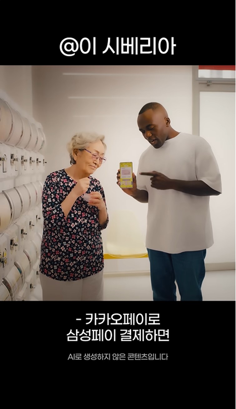 최근 카카오페이에서 삼성페이 결제를 알리기 위한 캠페인을 진행했습니다. 이는 기존에 AI 활용으로 대중에게 인지된 ‘야나두’ 광고를 패러디한 캠페인 입니다. 실제로 해당 원본 광고와 유사한 인물들을 섭외하여, 의도적인 AI적 연기로 '휴먼 터치’한 광고 입니다.